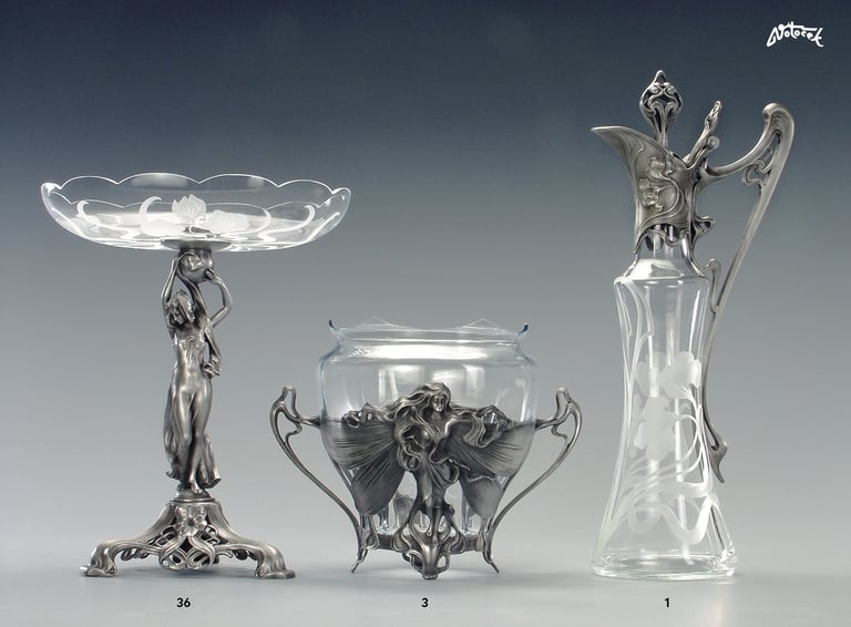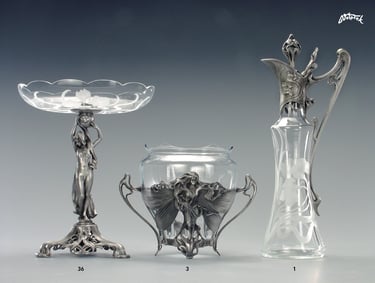 Jardiniere with winged girl and Art Nouveau ornaments on front and back. Britannia - Metal (tin and antimony alloy). Glass - Cut crystal glass with optical decoration. Inspired by WMF.