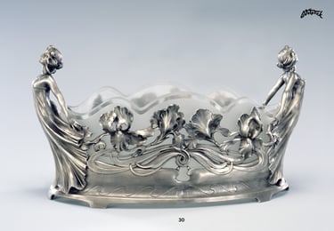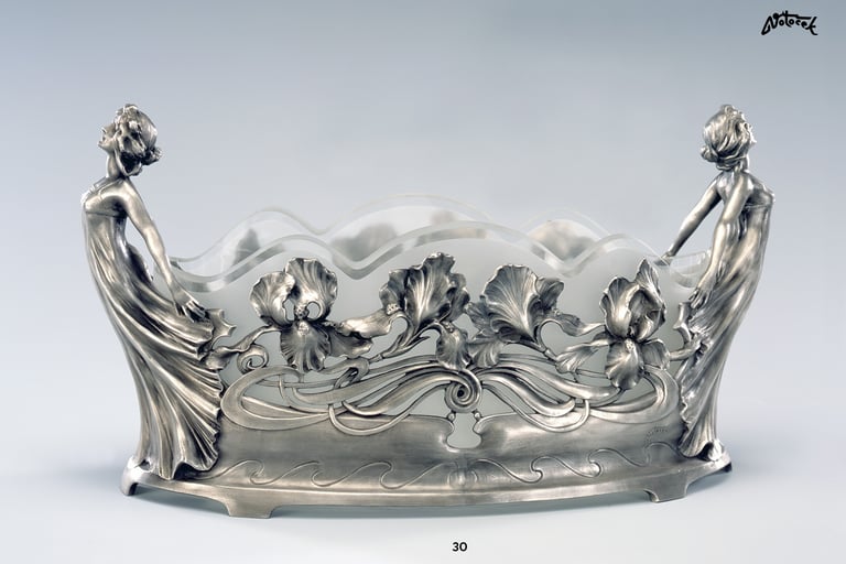 Jardiniere with two female figures and iris flowers on the front and back. Britannia - Metal (tin and antimony alloy). Glass - cut crystal glass with embossed decoration. Inspired by WMF.