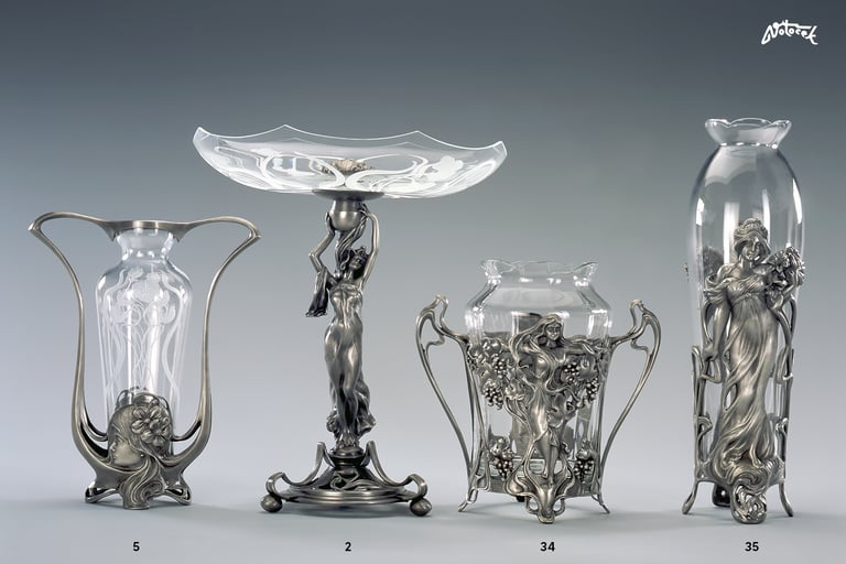 Motif of a girl's head with clematis flowers in her hair on both sides of the vase. Britannia - Metal (tin and antimony alloy). Glass - Crystal glass with embossed floral motif. Inspired by WMF.