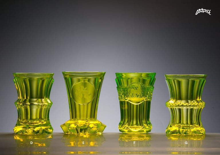 Transparent glass and uranium oxide additive, hand-blown, hand-cut. The gently glowing, yellow-green uranium glass, the so-called Annagelb (Anna's Yellow), was named after his wife by the author of this glass colouring technique, the North Bohemian "glass king" Josef Riedel (1816 - 1894). He introduced the production of uranium glass in the 1840s in Polubný in the Jizera Mountains. In the same area and using the same production process, these reproductions are made today, almost indistinguishable from the 150-year-old originals.