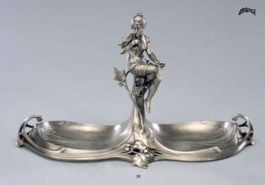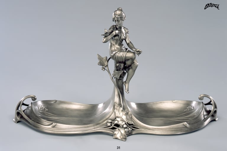 Dekorativní dvojmiska se sedící dívkou a břečťanem. Britannia - Metal (slitina cínu a antimonu). Inspirováno firmou WMF.
