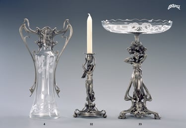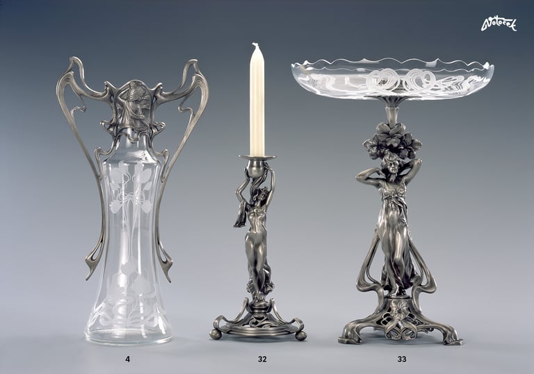 Váza s profilem ženy a secesním ornamentem na obou stranách. Britannia - Metal (slitina cínu a antimonu). Sklo - kříšťálové sklo s reliéfním květinovým motivem. Inspirováno firmou WMF.