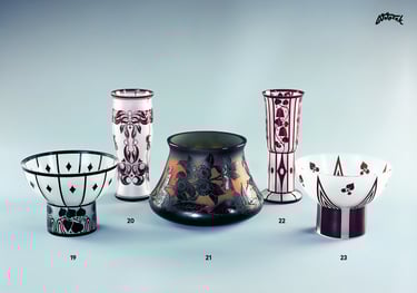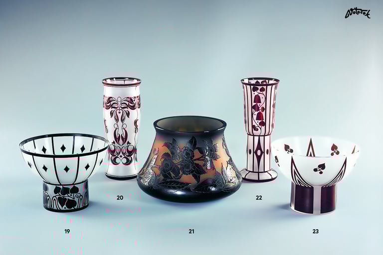 ručně foukané čiré sklo, 2–3 × pálená měděná lazura, pískovaný dekor Inspirováno návrhy předních architektů a designérů vídeňské secese Josefa Hoffmanna (1870–1956) a Hanse Bolka (1890–1978) pro věhlasnou šumavskou sklárnu Johann Loetz Witwe v Klášterském Mlýně. Čisté a jednoduché tvary i jemný ornament s typickými lístky, zvonečky a geometrickými obrazci působí dnes stejně moderně a exkluzivně jako v době svého vzniku.