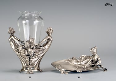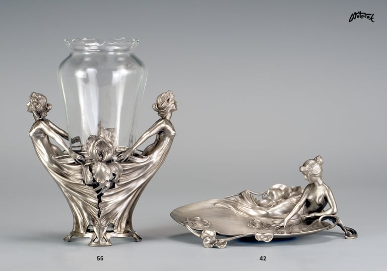 Váza s dvěma postavami žen a květy kosatců na přední i zadní straně. Britannia - Metal (slitina cínu a antimonu). Sklo - broušené křišťálové sklo s optickým dekorem. Inspirováno firmou WMF.